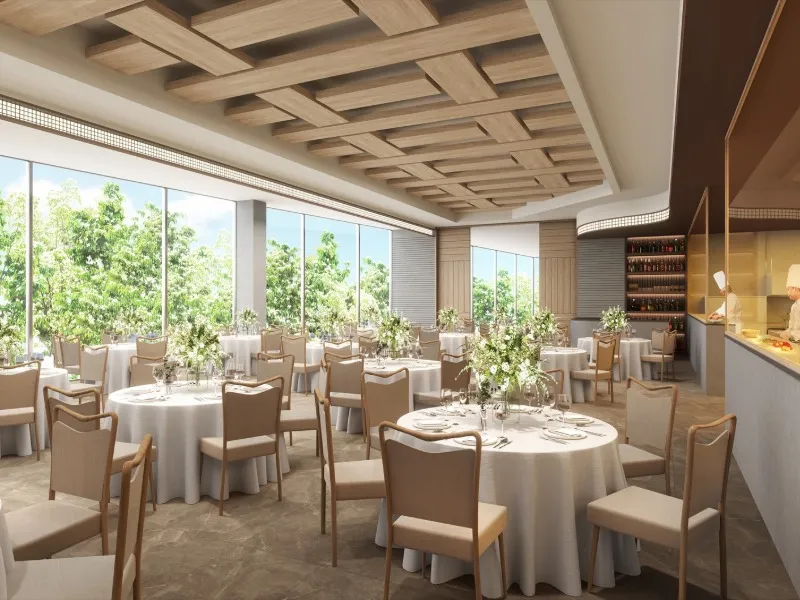 【130名が寛げる洗練空間×オープンキッチン併設】◆大きな窓から降り注ぐ自然光と、爽やかな緑が印象的なパーティ会場◆ゲストと美味しい料理を囲み、会話を楽しむ和やかな時間を過ごして